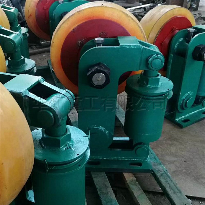 L系列滾輪罐耳用于礦山提升容器的導(dǎo)向緩沖,本產(chǎn)品采用先進(jìn)的密封技術(shù),適應(yīng)淋水、煤塵等惡劣環(huán)境。輪頭安裝采用三鎖緊結(jié)構(gòu),避免掉輪頭事故的發(fā)生。滾輪采用四氫呋喃-環(huán)氧丙烷共聚醚型聚氨酯澆注,具有高彈性、耐撕裂、抗水性、抗油性的優(yōu)點(diǎn)。滾輪磨損補(bǔ)償調(diào)節(jié)采用左、右旋螺桿,調(diào)節(jié)迅速便捷。機(jī)座、擺架采用優(yōu)質(zhì)鋼板焊接成型,體積小、重量輕,安裝輕便。滾輪罐耳主要由輪軸、支架、緩沖裝置、底座等組成